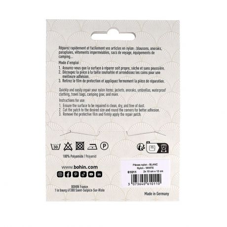 Les pièces de réparation autocollantes BOHIN permettent de réparer facilement les vêtements de sport, articles de voyage et de camping (tentes), accessoires (parapluie...), en viscose, polyamide, vinyle et autres tissus synthétiques lisses.