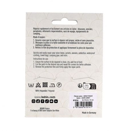Les pièces de réparation autocollantes BOHIN permettent de réparer facilement les vêtements de sport, articles de voyage et de camping (tentes), accessoires (parapluie...), en viscose, polyamide, vinyle et autres tissus synthétiques lisses.