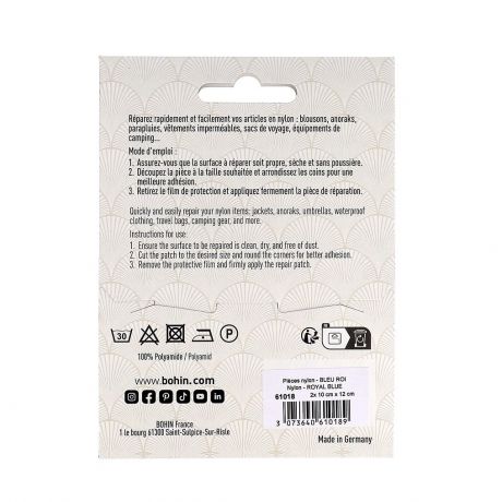 Les pièces de réparation autocollantes BOHIN permettent de réparer facilement les vêtements de sport, articles de voyage et de camping (tentes), accessoires (parapluie...), en viscose, polyamide, vinyle et autres tissus synthétiques lisses.