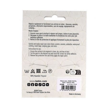 Les pièces de réparation autocollantes BOHIN permettent de réparer facilement les vêtements de sport, articles de voyage et de camping (tentes), accessoires (parapluie...), en viscose, polyamide, vinyle et autres tissus synthétiques lisses.