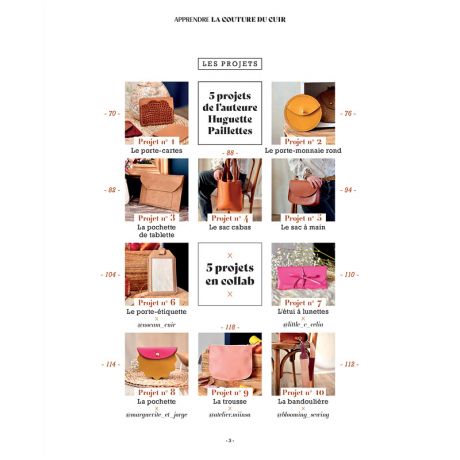 Il invite à réaliser 10 créations en cuir hyper tendance et faciles à coudre : porte-cartes, porte-monnaie rond, pochette de tablette, sac cabas et sac à main, porte-étiquette, étui à lunettes, trousse...