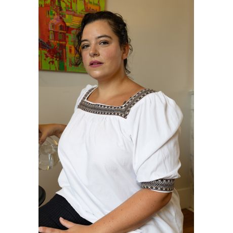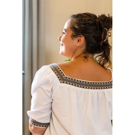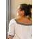 Mettant en valeur une encolure carrée et des manches ballon de longueur 3/4 avec des bracelets de bas de manches, cette pièce incarne la féminité avec délicatesse.