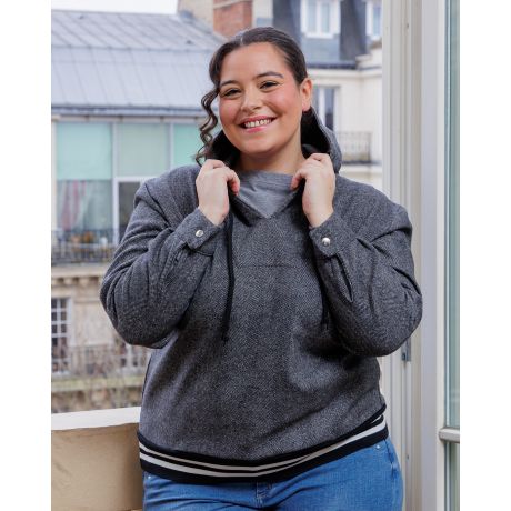 Ce modèle offre une multitude d’options pour s’adapter à toutes vos envies : choisissez entre un col ou une capuche et plusieurs finitions pour le bas : une taille élastique, un bord-côte ou une coupe droite. Avec 6 possibilités en un seul patron, Nyx s’impose comme un incontournable de votre garde-robe.