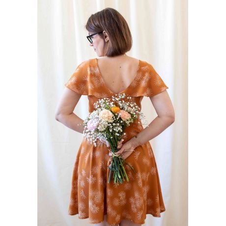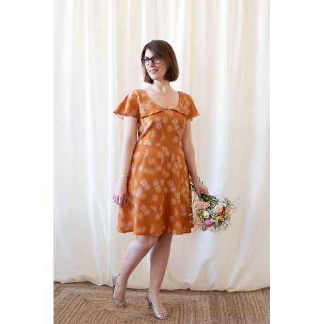 Belle de champs la jolie robe de Lise Tailor avec de jolis volants sur les épaules qui viennent sublimer le décolleté en V sur le devant et le dos. Sa coupe flatteuse met la taille en valeur grâce aux pinces et à sa jupe patineuse qui tourne juste comme on aime.