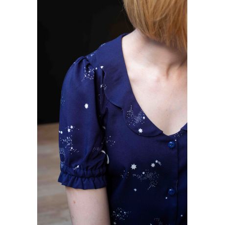 Comète de Lise Tailor est une robe délicate et raffinée. Boutonnée devant, élastiquée à la taille et dotée d’un col festonné, le patron propose 2 versions de manches ainsi qu’une version blouse.