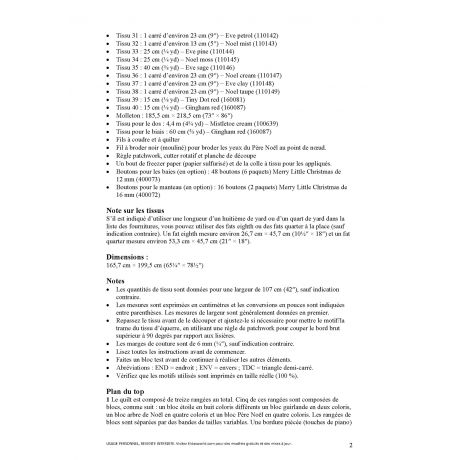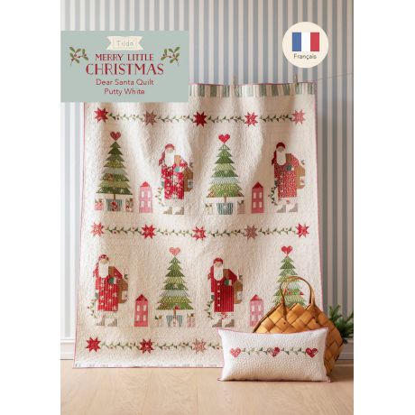 Ce merveilleux quilt promet de devenir un trésor de famille, et il sera parfait pour décorer votre foyer à Noël pour de longues années. Le motif représente le Père Noël portant des cadeaux, entouré de sapins de Noël, d’étoiles et de guirlandes de houx. Le choix des couleurs est résolument festif, un résultat obtenu grâce à la collection de tissus Merry Little Christmas et à ses coordonnés. Dans cette version, le fond en Chambray blanc crème est le parfait faire valoir pour les rouges, verts et bleus de saison. Un fond en tissu imprimé écossais de couleur pierre a été choisi pour un deuxième quilt reprenant ce motif. Toujours sur le thème de Noël, deux coussins « Guirlande de Cœurs » et un calendrier « Cher Père Noël » sont également disponibles ; les instructions sont à consulter sur tildasworld.com. Nous avons eu plaisir à employer une multitude de petits boutons en guise de baies pour ce quilt, et des boutons plus grands pour le manteau du Père Noël. Mais le résultat sera tout aussi réussi avec des cercles appliqués. Vous pouvez également broder les baies si vous préférez.