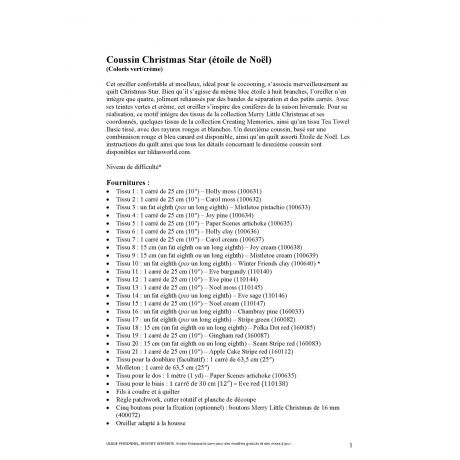Cet oreiller confortable et moelleux, idéal pour le cocooning, s’associe merveilleusement au quilt Christmas Star. Bien qu’il s’agisse du même bloc étoile à huit branches, l’oreiller n’en intègre que quatre, joliment rehaussés par des bandes de séparation et des petits carrés. Avec ses teintes vertes et crème, cet oreiller s’inspire des conifères de la saison hivernale. Pour sa réalisation, ce motif intègre des tissus de la collection Merry Little Christmas et ses coordonnés, quelques tissus de la collection Creating Memories, ainsi qu’un tissu Tea Towel Basic tissé, avec des rayures rouges et blanches.