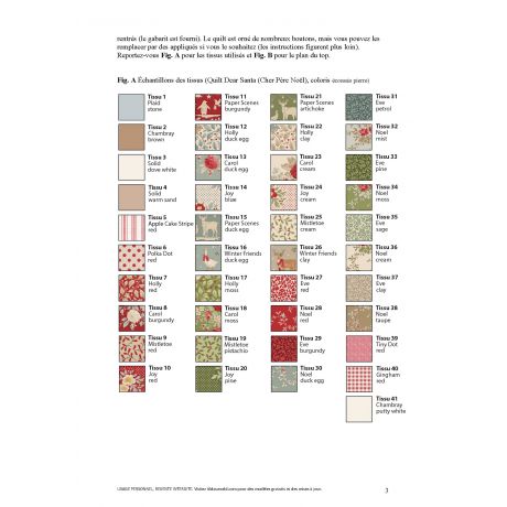 Ce magnifique quilt rendra Noël encore plus festif Le motif représente le Père Noël portant des cadeaux parmi sapins de Noël, étoiles et guirlandes de houx. Le choix des couleurs est résolument festif, un résultat obtenu grâce à la collection de tissus Merry Little Christmas et à ses coordonnés. Pour cette version du quilt, le fond en tissu écossais couleur pierre crée une charmante atmosphère folklorique, associé aux rouges, verts et bleus de saison. Un tissu en Chambray blanc crème a été choisi pour le fond d’un deuxième quilt reprenant ce motif