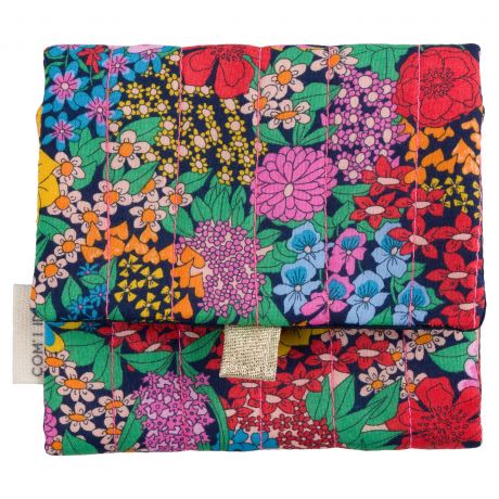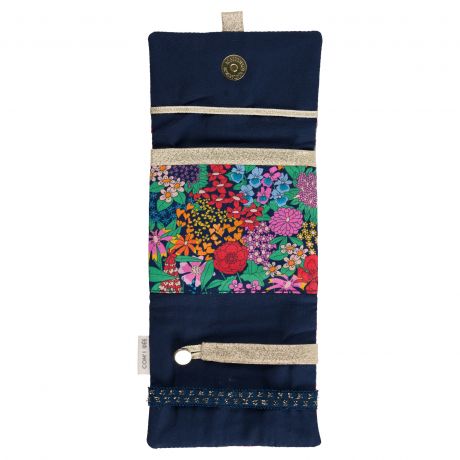 Kit pour réaliser une jolie petite pochette nomade pour ranger les bijoux. Ce projet est idéal pour apprendre à matelasser du tissu, poser du biais et fixer un bouton aimanté.