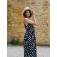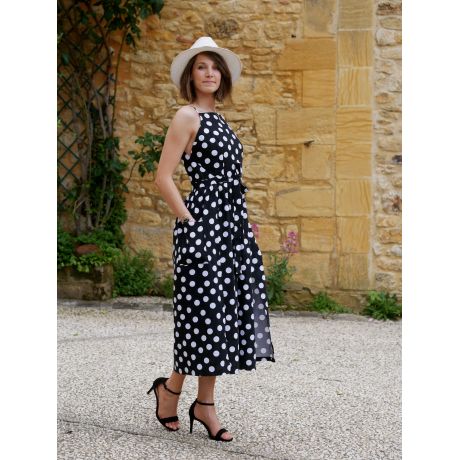 haut à bretelles, deux pans de jupe froncés s’attachant avec une