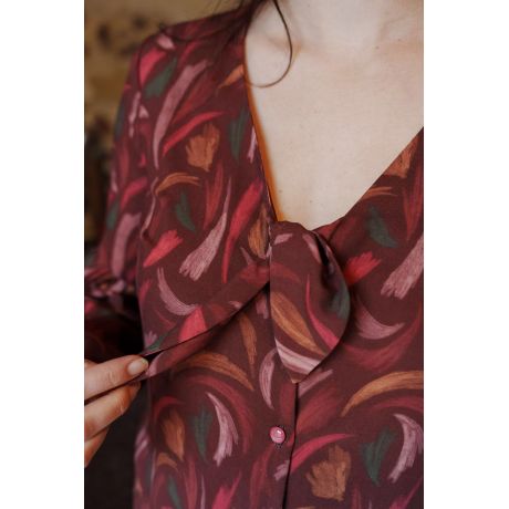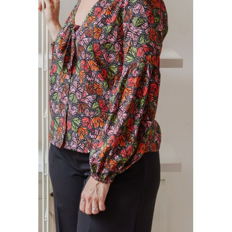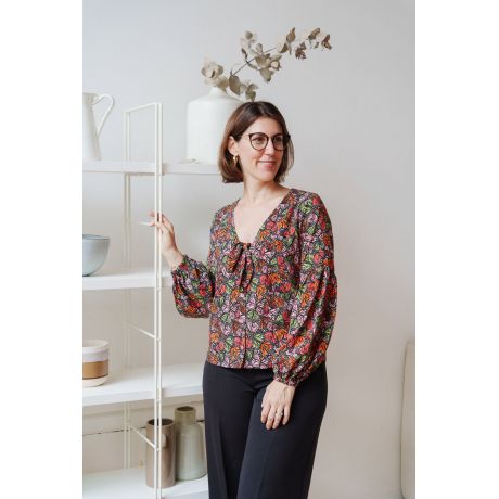 Monarch de Lise Tailor est une blouse à la coupe fluide est idéale pour la mi-saison avec ses manches longues légèrement bouffantes, froncées au-dessus du coude et terminées par un poignet élastiqué. Son encolure en V se décline en version boutonnée classique ou avec un lien à nouer pour une touche plus délicate. Structurée par des pinces poitrine, elle allie confort et élégance dans un modèle facile à coudre et à porter au quotidien.