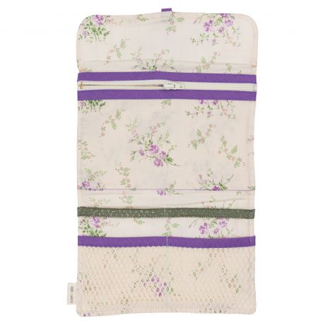 La pochette possède : 1 poche avec fermeture Eclair, qui permet de garder en sécurité vos accessoires, une pochette en filet et une bande élastique pour accrocher bijoux ou barrettes.
