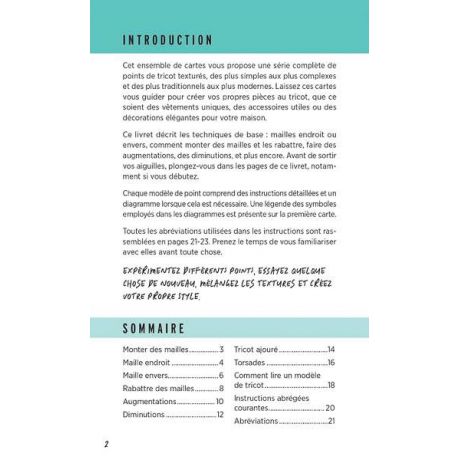 Cet ensemble de cartes vous présente des points de tricot texturés, des plus simples aux plus complexes : point de riz, côtes, torsades, points ajourés...